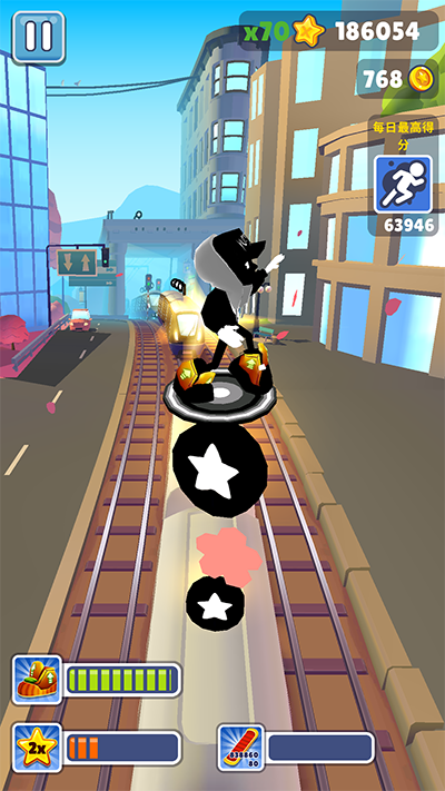 初次进入地铁跑酷Easft仿外网温哥华版本时,只需轻触屏幕即可开始游戏冒险。游戏开始后,玩家需要控制角色躲避后方警察的追捕,同时还要注意前方的各种障碍物。当遇到低矮障碍物时,向上滑动屏幕即可让角色跳跃而过;若遇到较高的路牌或横杆,则需要向下滑动让角色滑行通过。在复杂的轨道场景中,玩家需要特别留意两侧的地铁列车,及时向左或向右滑动来避开危险。值得一提的是,游戏中双击屏幕可以激活滑板道具,在滑板状态下即使撞上列车也不会立即结束游戏,这为新手玩家提供了很好的容错空间。