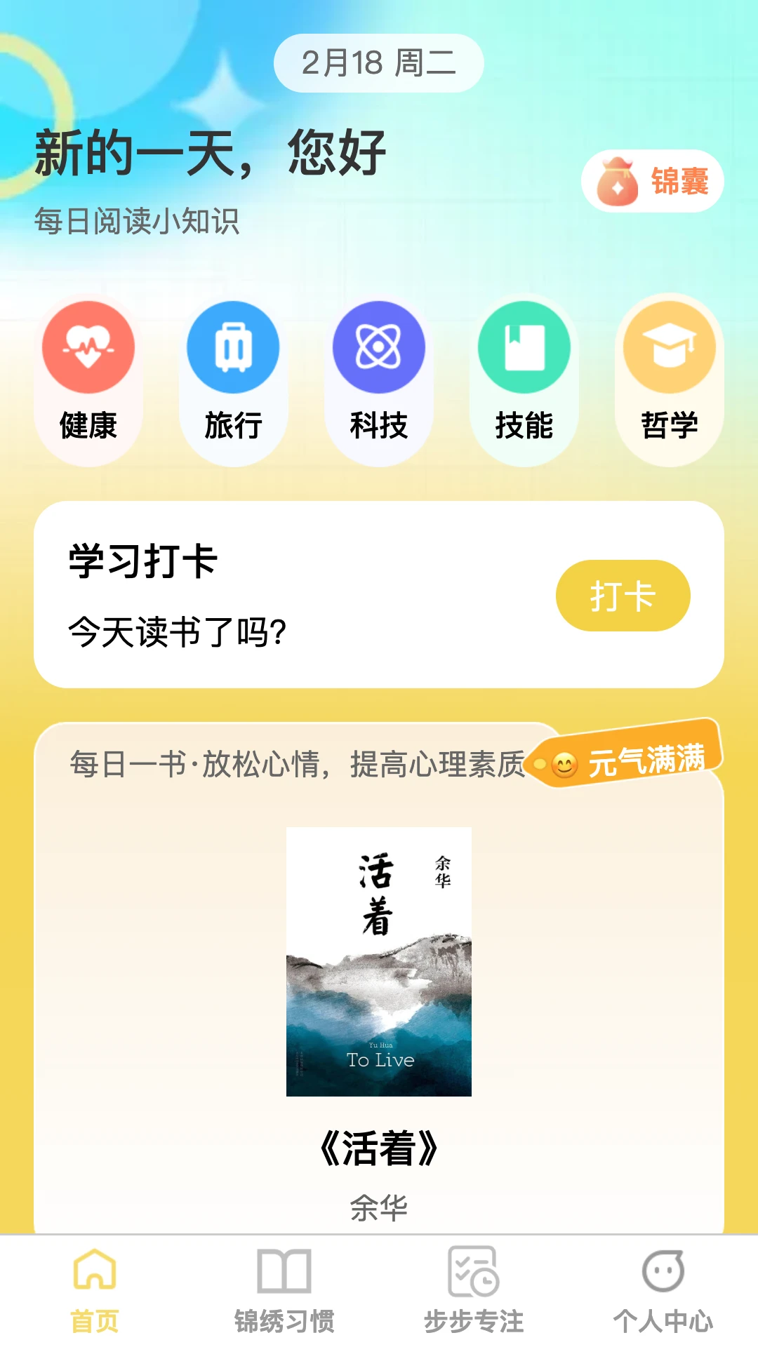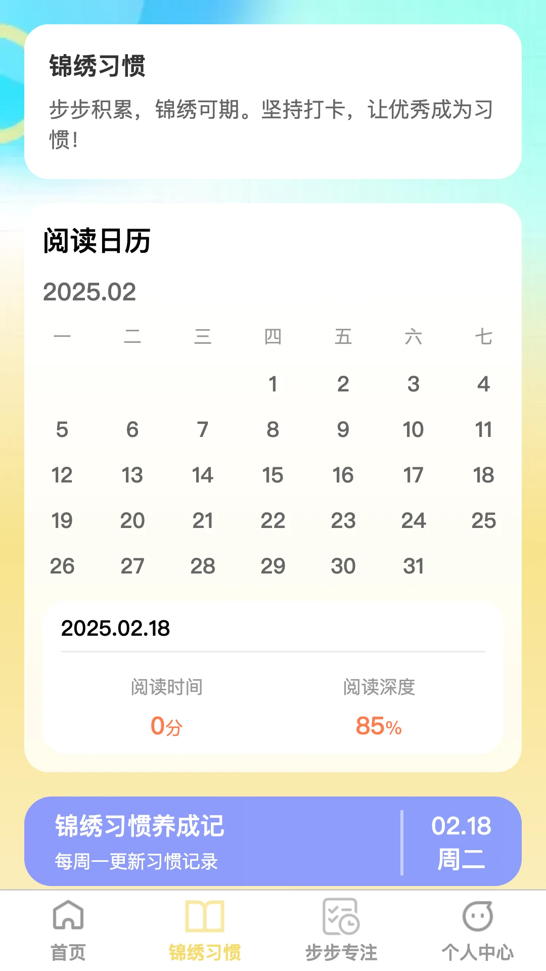 步步锦绣是一款集知识与专注功能为一体的应用。让每一步的学习都充满成就感,每一步成长都绽放锦绣。【首页】首页提供多个主体的锦囊知识、学习打卡和书籍介绍。无论是接收外界的新信息还是阅读书籍,这里都能找到适合您的学习内容,帮助您不断提升自我,为锦绣前程铺路。【锦绣习惯】"锦绣学习"功能帮助您记录每个月的学习阅读时长,还可以建立目标任务打卡签到,一步步地助您达成目标养成好习惯、专注学习、工作、成长的好习惯。步步积累好习惯,前程锦绣可期。【步步专注】"步步专注"功能帮助您记录专注学习时间。通过了解您的专注时间记录,帮助更好地管理注意力,提升学习效率,实现高效的知识积累和能力提升。除外,为您提供高效学习/办公的技巧,更好地掌控学习时间。步步锦绣,邀您一同踏上高效与健康的每一步。从商务技能的学习到专注时间的记录,再到健康数据的管理,我们致力于为您的每一刻提供全面的支持。步步锦绣,让每一步都充满成就与美好,每一天都走向锦绣前程。