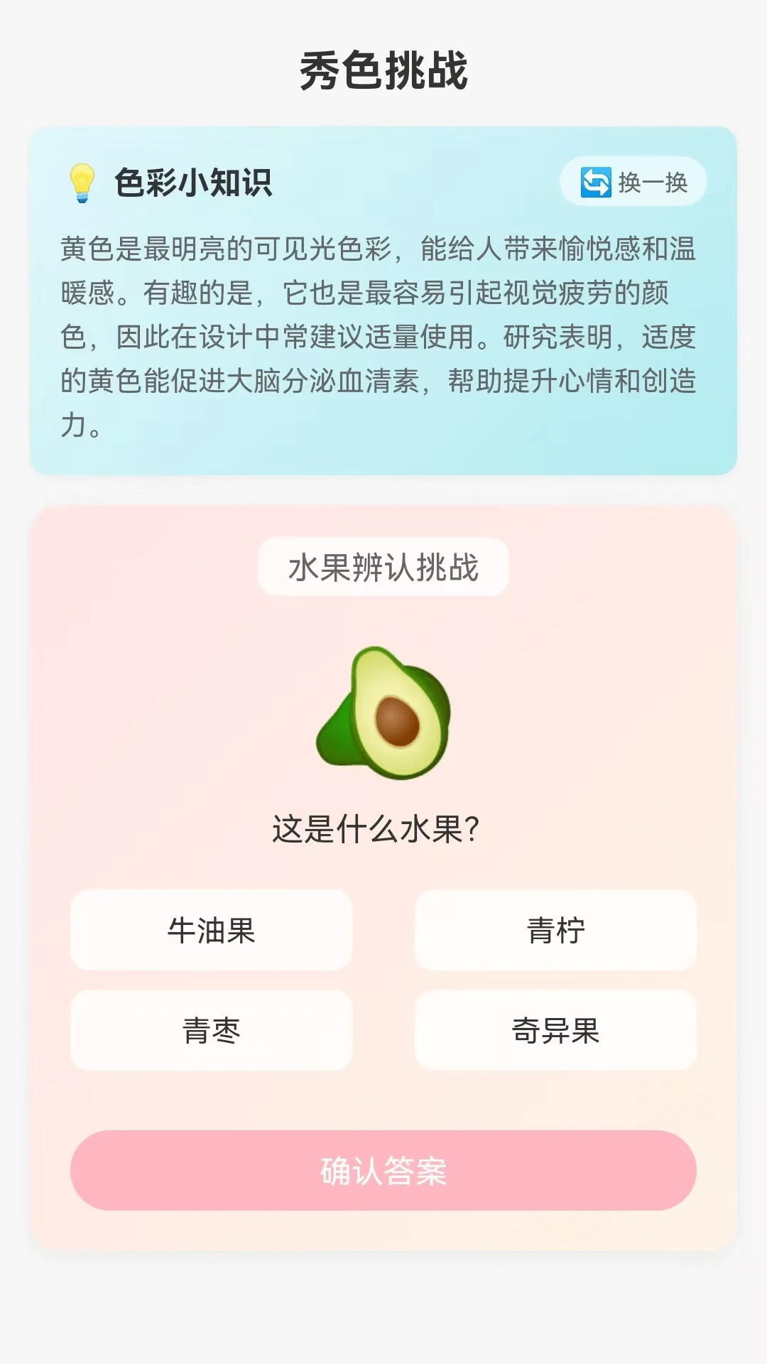 秀色果果是一款关于果味配色的实用性软件,具有果果提色,提取水果的自然色彩,提供给您色彩的灵感启发;以及果味配色,展示多组水果风味的颜色搭配色卡,喜欢的话,下载试试吧~