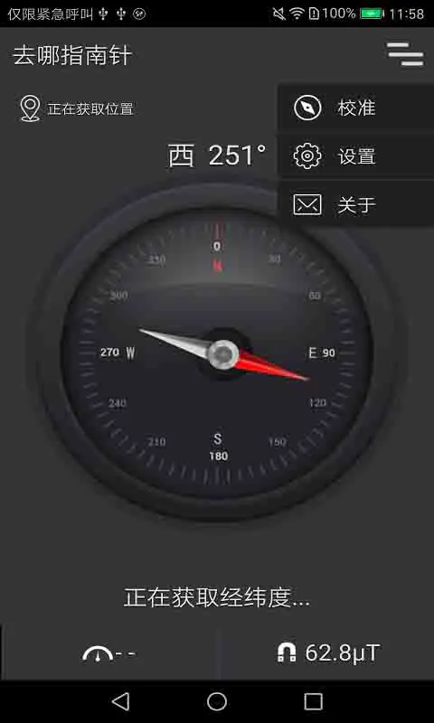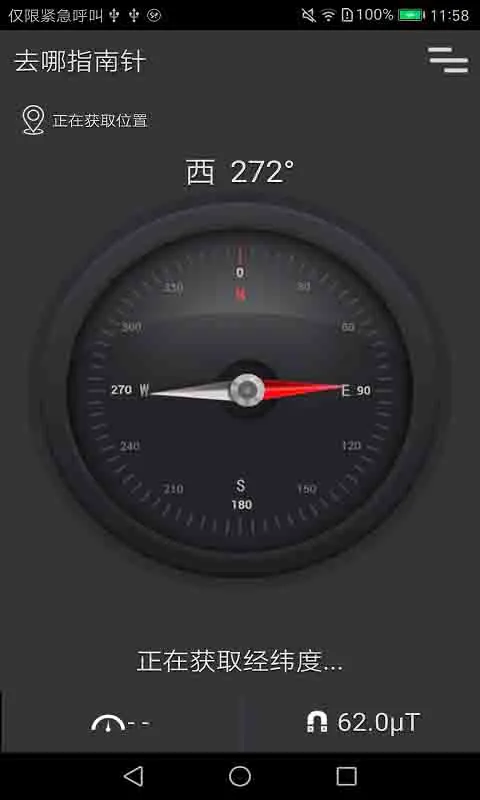 指南针即刻版是一款出行必备、让你快速找到方向感的指南针。简洁、准确,一秒辨别方向。产品特点:--快速显示箭头方向,轻松搞定东南西北,保证360度旋转都不迷方向;--GPS定位地理位置,身处何处全知道,还可跳转到地图,方便随时随地导航,更有一键分享,集结您的小伙伴;--支持经度、纬度、海拔、速度、磁场强度数据显示,上滑即可掌握所有信息;--浅显易懂的校准动画,快速学会校准,提高去哪指南针的精准度。