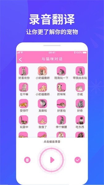 与猫交流,点击各种猫的头像有不同的场境对话,也可以翻译您讲的话给猫听。内置多种猫咪情绪场景模拟,让您体验与猫咪互动的真实乐趣。