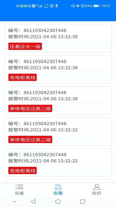 云bms安卓版拥有多种告警信息标签,包括压差过大一级、充电柜离线以及单体电压高过二级等,帮助用户快速识别电池问题。软件还为用户统计了不同状态的设备,并将它们汇总到不同栏目,方便用户分类管理。告警信息实时更新,用户只需切换到告警栏目即可查看最新告警内容,确保第一时间掌握电池状态。此外,软件支持实时数据更新功能,用户点击更新标签即可刷新数据,获取最新的电池信息。