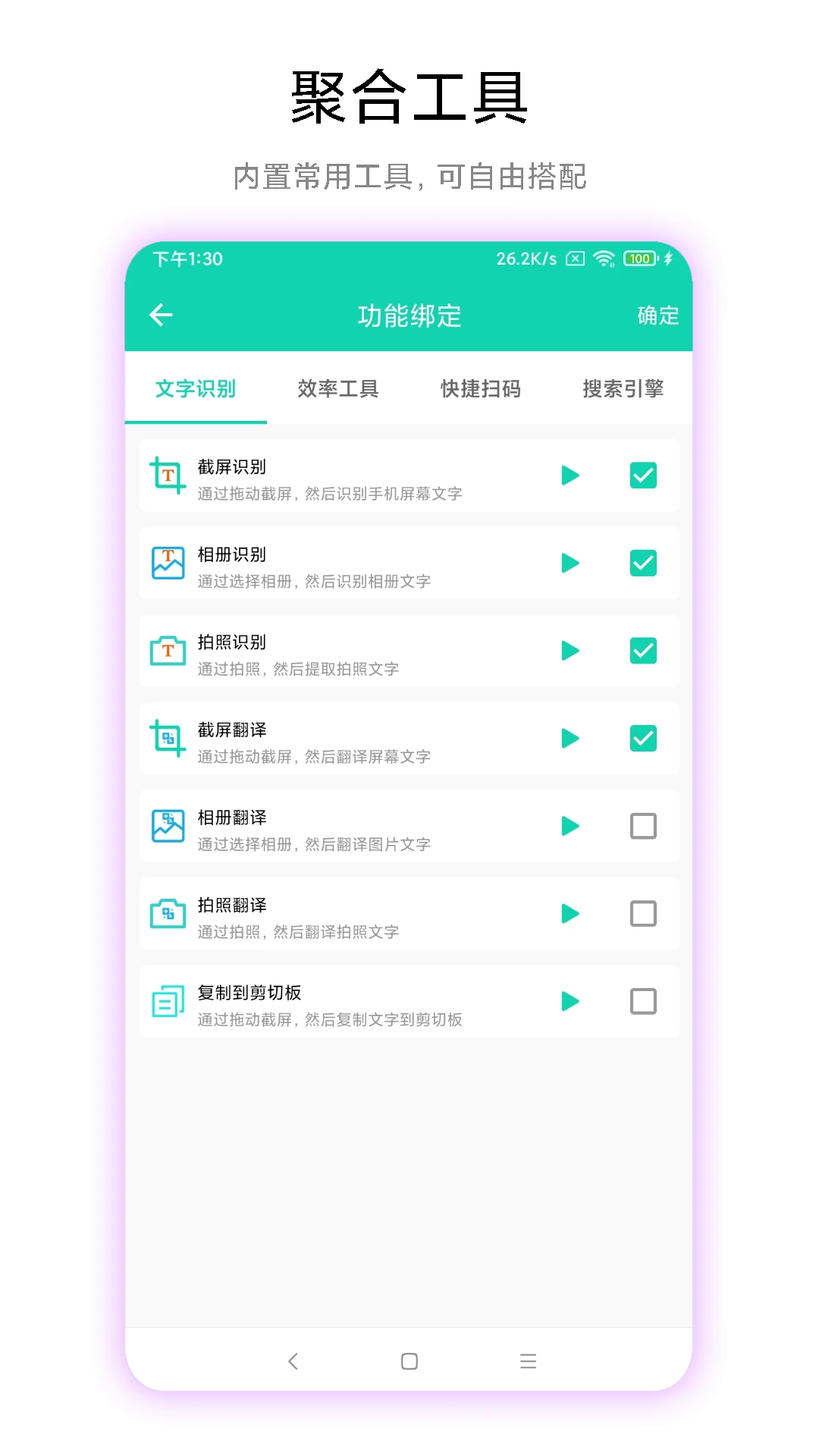 一款文字识别工具APP,目前支持:截图识别文字、拍照识别文字、翻译屏幕文字、翻译相册文字、截图打码、快速打开常用扫一扫、快速进行区域截图、快速截图分享、截图并收藏到笔记等。
