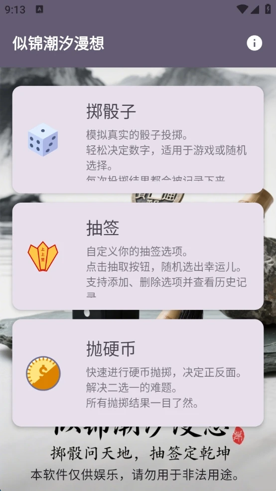 似锦潮汐漫想是一款随机决定助手工具APP,在难以做选择是用户可以通过抛骰子、抽签、抛硬币来随机决定,并且抽签支持用户自定义内容。