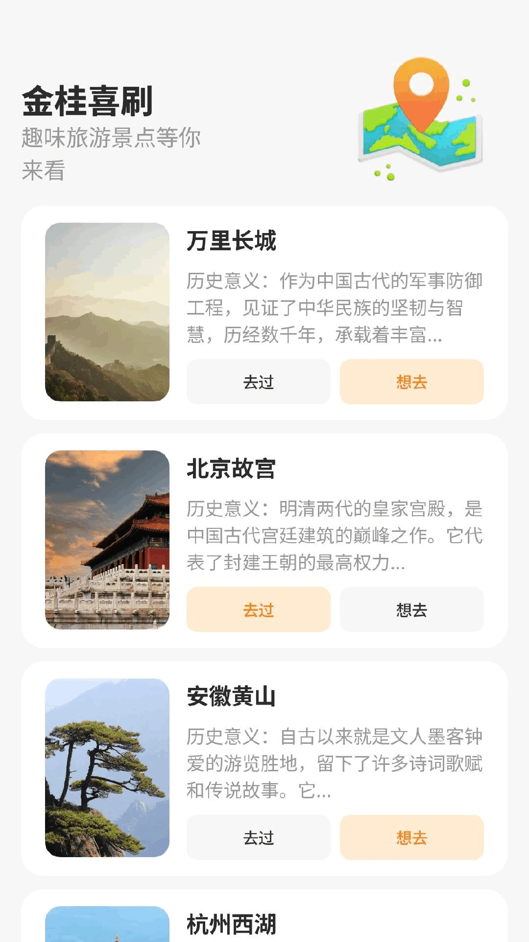 打卡功能支持用户标记“去过”或“想去”的景点,方便记录旅行足迹和规划未来行程。