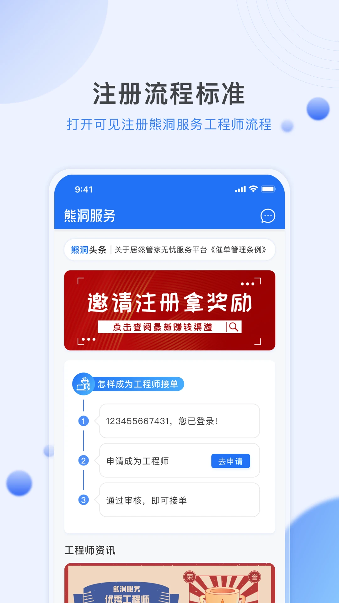 熊洞服务APP,是北京熊洞智服科技有限公司专为智能家居服务工程师开发的接单平台,服务品类主要包括全屋智能、家电、安防、照明、卫浴等产品的安装、维修、保养、保洁等,服务覆盖全国,工程师通过APP完成培训、接单、完单及结算,还可以带货销售获取收入。熊洞服务,起始于2004年的第三方净水服务平台——无忧服务。18年以来,平台从专业净水服务入手,逐步扩充到了家电、卫浴、智能门锁、灯具等各种品类,品类不断扩充,平台单量持续增长,同时也为越来越多的服务工程师带来了收入,实现了自我价值。2022年,平台品牌正式升级成“熊洞服务”,将专注于全屋智能、家电、安防、照明、卫浴等智能家居产品的服务交付。选择熊洞服务平台的10大优势•专注智能家居服务领域智能家居是市场发展趋势,行业潜力大,技术要求高,用户需求多,尤其是全屋智能的快速普及将带来更多的服务需求。•服务品类多智能家居服务的品类很多,既包括智能化升级后的家电、卫浴、照明灯具等,又有技术更复杂的全屋智能服务,技术综合性要求更高。3、服务商家多,大品牌多目前平台签约合作品牌超过200家,行业知名品牌多,服务规范化程度高。4、合作模式灵活“自营+平台”结合的合作模式,自由选择,稳定合作,稳定订单,确保稳定收益。5、结算提现快工单完成后快速审核,快速结算,不拖账期,随时操作提现,提现到账快。6、带货平台增加收入为工程师定制智能家居产品带货分销服务,大品牌,产品多,轻松获取更多收益。7、持续专业培训持续针对不同品类、不同品牌、不同产品型号的专业技能培训,打造智能家居服务行业标杆,让工程师服务技能更专业更全面。8、专业客服支持自营客服团队,有问题快速响应快速解决,结算、订单、技术、发货一站解决。9、智能派单系统根据服务品类、工单位置、合作模式等智能派单,实时推送,高效操作。10、专业保险保障所有服务工单都提供保险支持,保障工程师利益。熊洞服务欢迎具备全屋智能设计施工,以及家电、安防、照明、卫浴等产品的安装、维修、保养、保洁等专业技能的工程师注册合作。联系熊洞服务:官方微信公众号:xiongdongfuwu联系邮箱:leiping@fuwu.work联系微信号:18963942236