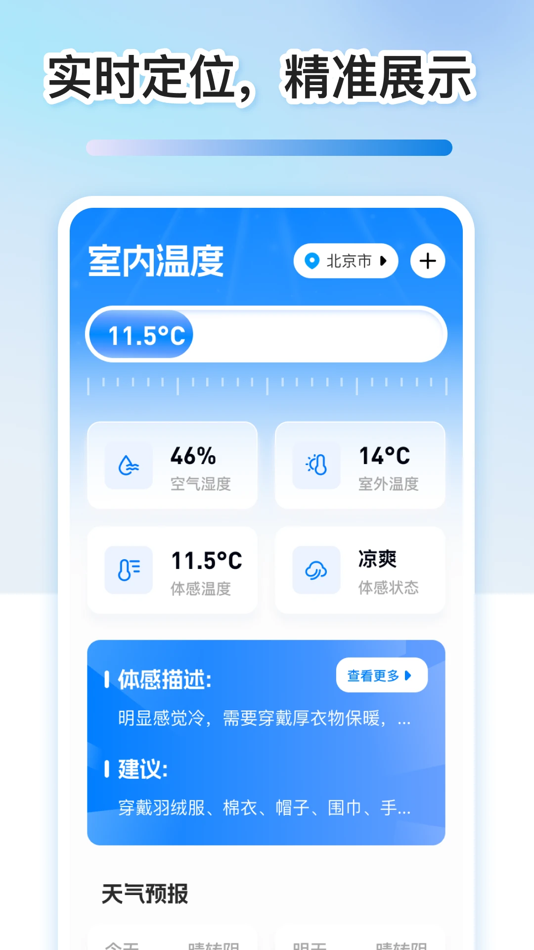 室内外温度计采用先进的定位技术和实时天气数据接口,准确获取您当前所在位置的室内温度、空气湿度、室外温度以及体感温度。无论您身处何地,都能迅速了解周围环境的气象状况。天气预报提供未来24小时的详细天气预报,包括温度、风力、空气质量等关键信息,帮助用户提前规划出行。体感描述根据实时天气数据,提供详细的体感描述,让您直观感受当前天气的冷暖程度。穿衣建议根据天气变化,智能推荐适合的穿衣搭配,让您在不同天气下都能保持舒适与时尚。空气指数实时监测并展示空气质量指数(AQI),让您了解当前环境的空气质量状况。生活指数提供生活指数建议,如紫外线强度、运动指数、洗车指数等,全方位呵护您的生活品质。黄历功能融入传统黄历文化,提供每日宜忌、查看吉时等功能,让您在了解天气的同时,也能参考黄历信息,做出更加合理的日程安排。界面友好采用简洁直观的界面设计,用户操作便捷,信息一目了然。功能丰富集温度监测、湿度测量、天气预报、空气指数、生活指数、黄历功能于一体,满足您多样化的生活需求。