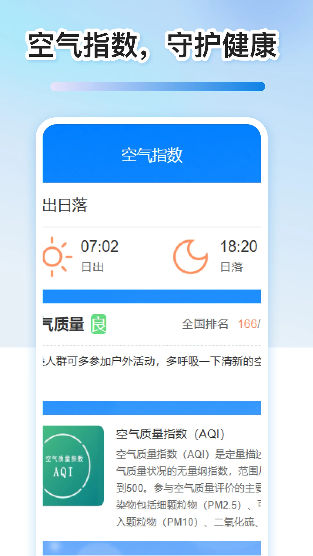 空气质量监测:实时显示AQI指数,包括PM2.5、PM10等污染物浓度,保障呼吸健康。