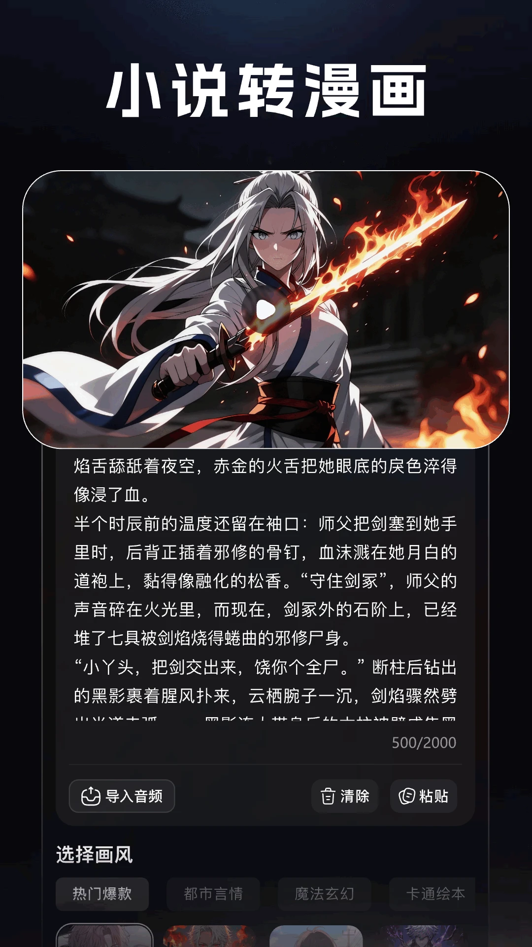 AI漫剧生成:用户只需导入小说文案或故事创意,系统即可自动生成完整的漫剧视频,大幅降低创作门槛。