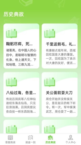 历史典故:逍遥答题的历史典故板块汇集了古今中外的精彩历史故事和名人轶事。通过生动有趣的讲述方式,让枯燥的历史知识变得鲜活起来。您可以在这里了解重大历史事件的来龙去脉,感受历史人物的智慧与魅力,在轻松阅读中拓宽视野,丰富文化素养。