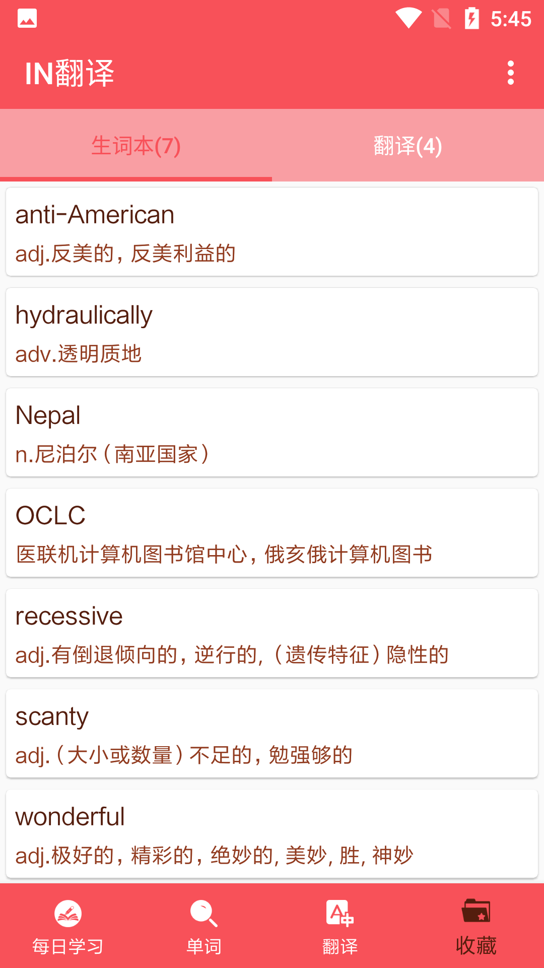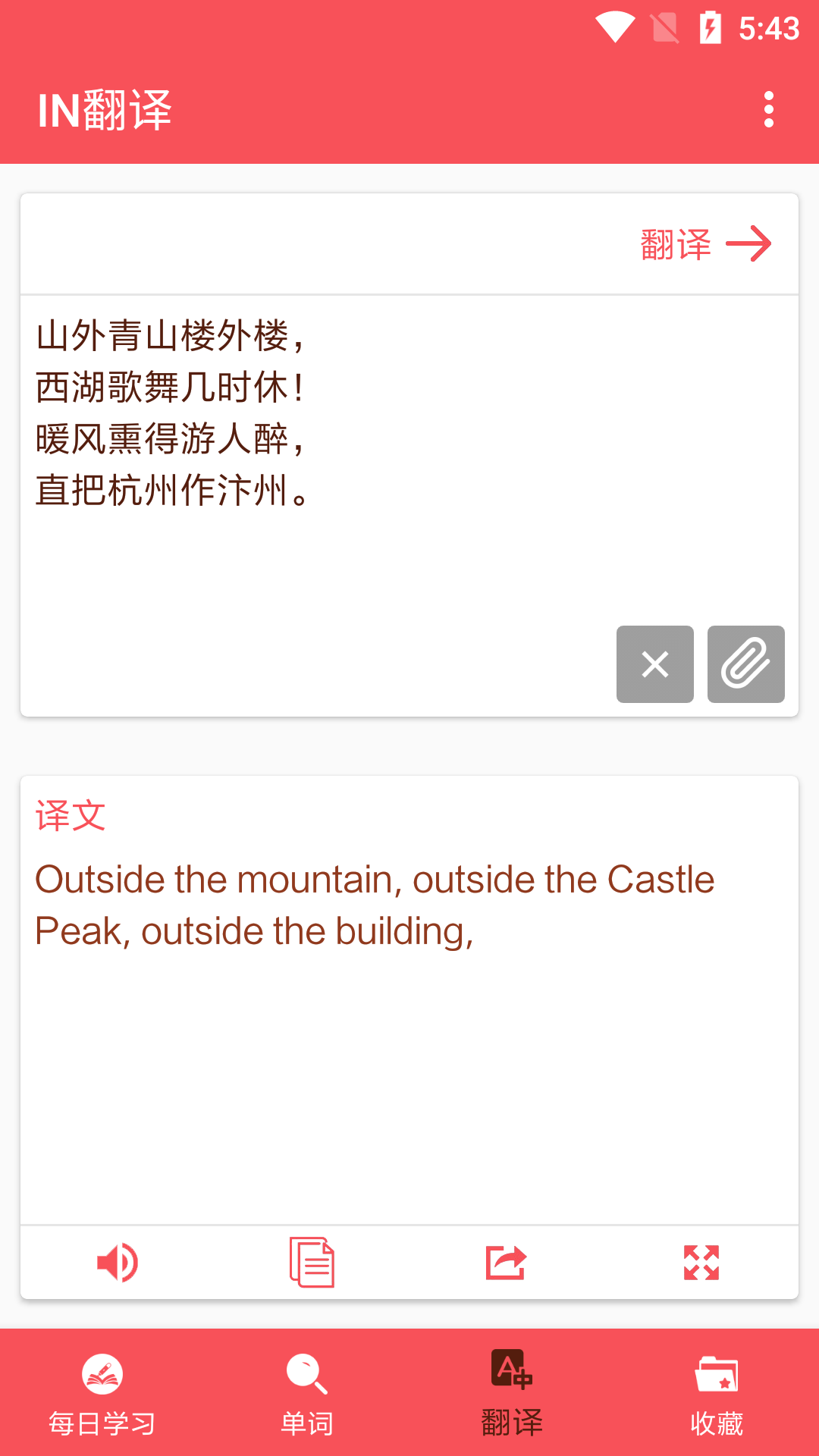 还在为英语学习而苦恼吗?IN翻译app是您学习英语的得力助手。它不仅提供精准的中英互译功能,还能给出详细的短句解释和标准发音示范,帮助您告别"哑巴英语"。内置丰富的网络常用语句示例,让您掌握地道表达。更有贴心的每日一句、随机学习模式和收藏功能,让英语学习变得轻松有趣。无论是阅读、写作还是口语练习,这款app都能为您提供全方位的支持。