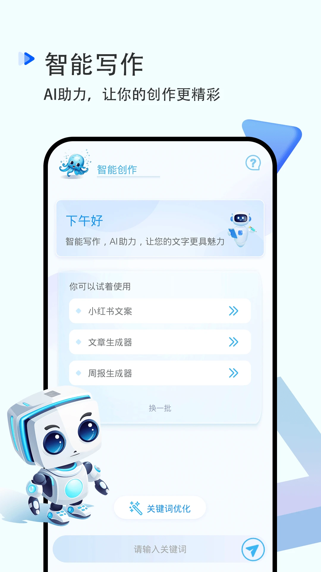 欢迎来到AI写作助手,您的个人创作伙伴!这款应用专注于AI素材生成和文笔者助手,帮助您轻松应对各种写作挑战。无论您是广告文案创作者,文创者,剧本编剧,还是视频脚本编写者,AI写作助手都能为您提供强大的支持。热门功能:1.小红书文案生成:一键生成吸引人的小红书文案,让您的内容更具吸引力。2.广告方案生成:根据您的需求,快速生成创新的广告方案。3.周报生成器:帮助您快速生成周报,让工作更加高效。4.文章生成器:根据您的主题,快速生成高质量的文章。5.视频脚本生成:为您的视频创作提供专业的脚本支持。6.在线诗人:让您随时随地体验诗歌的魅力。推荐功能:1.文章续写:为您的文章提供完美的结尾,让读者留连忘返。2.文章标题生成器:为您的文章提供吸引人的标题,让读者一眼就爱上。3.文本润色:让您的文字更加流畅,让读者更加享受阅读。4.AI小说家:为您的小说提供丰富的素材,让您的创作更加精彩。5.文章内容总结助手:为您的文章提供简洁的总结,让读者一目了然。6.PPT大纲:根据主题快速给你生成一份高质量的PPT大纲