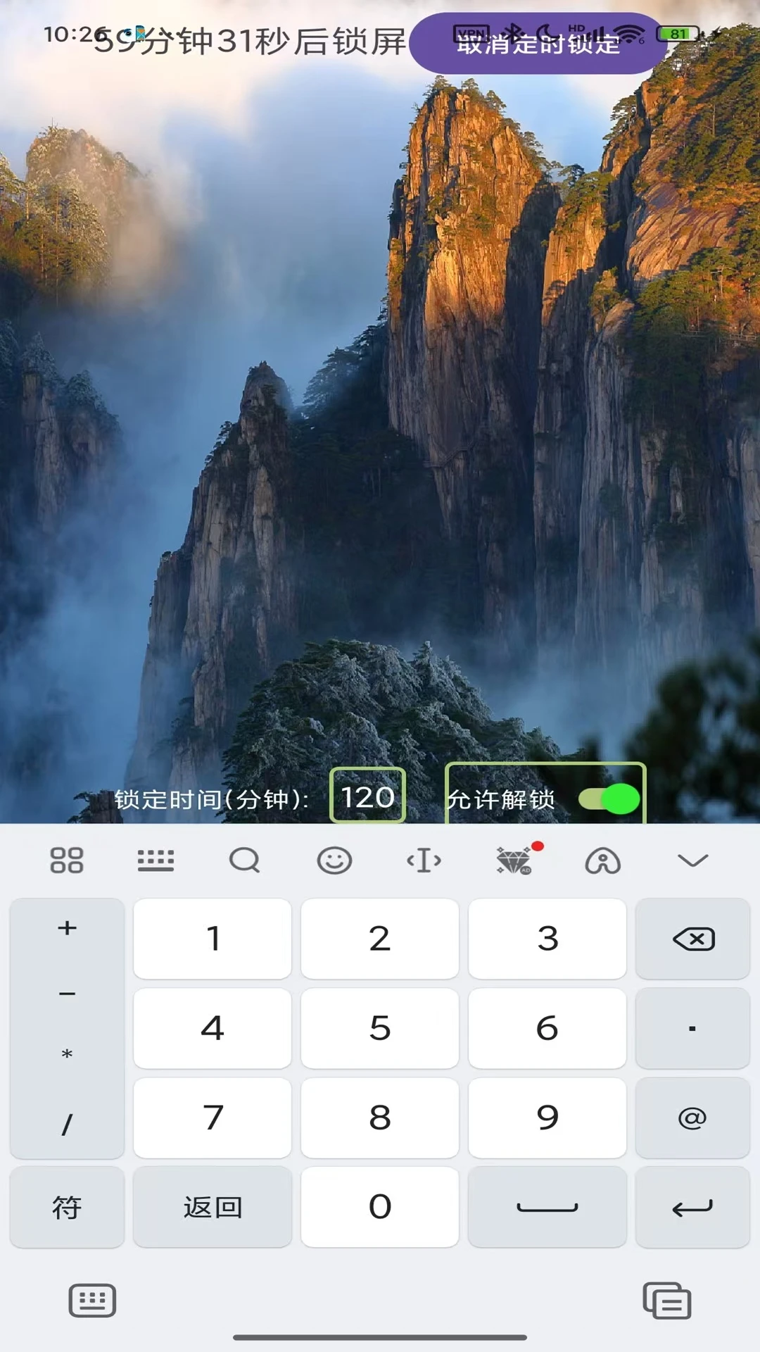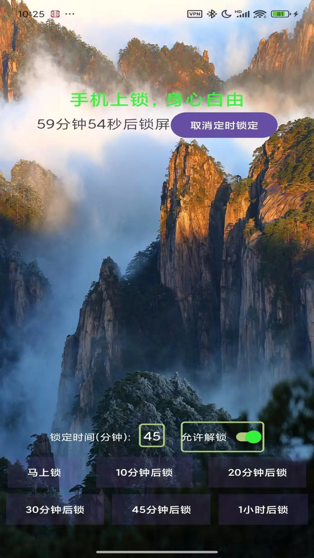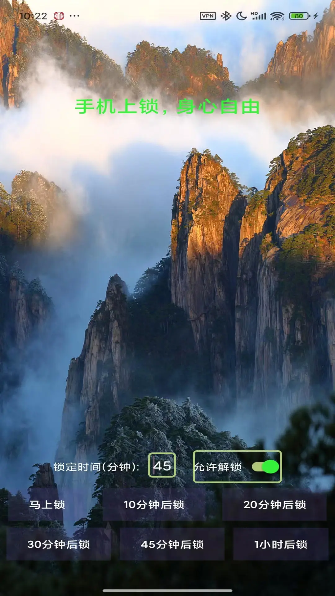 主要有两个功能,立即上锁和定时上锁。比如,你想现在开始专注于学习或工作,避免手机干扰。设置锁定时间,默认是45分钟,可以修改。设置好后,点击“马上锁”按钮,则屏幕锁定,只有锁定时间到了才能解锁。右侧有个开关,“允许解锁”,默认是开的,也就是上锁后是否允许解锁,自律性强或者手机偶尔必须使用的情况;关闭开关后,锁定时间未到无法解锁,即使重启也不行,比较适合自律性差一点或手机不是必要工具的人。