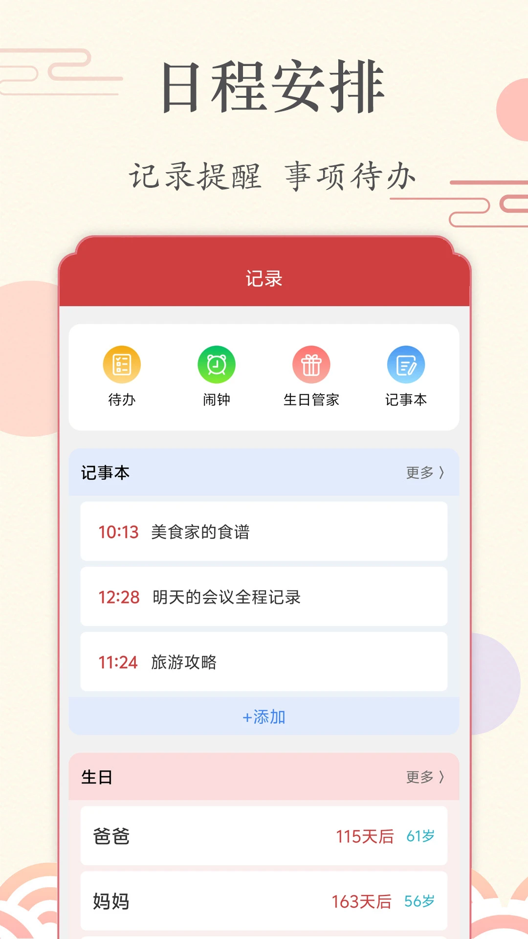 生日本管理:可记录生日、纪念日等重要日期,并设置提前提醒,避免遗忘特殊日子。