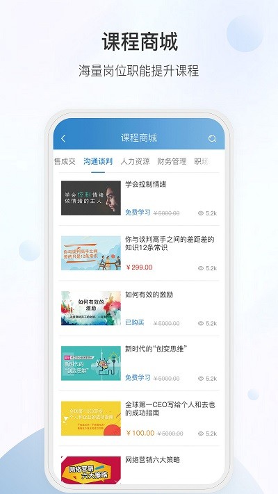 可以看到各种类型的课程信息,提供课程商城,跟随课程更系统化的学习。商城课程按岗位、职级、行业等多维度分类,支持课程试看和用户评价,帮助选择最适合的学习资源。