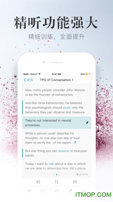 根据考满分名师团队多年教学经验开发的专业精听功能,所有听力材料都经过人工逐句切分和校对。支持0.5-2.0倍速调节,每句话可无限次重复播放,配合原文对照和重点词汇标注功能,帮助用户彻底吃透每个句子。系统会自动记录用户的精听进度和难点句子。