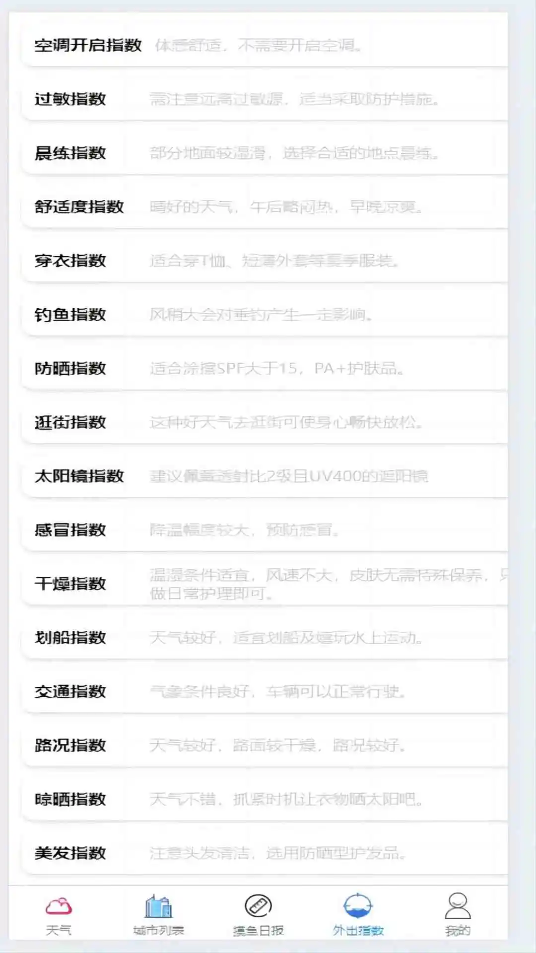 出行指数:综合天气、空气质量等因素生成出行评分,直观展示是否适合户外活动或旅行。
