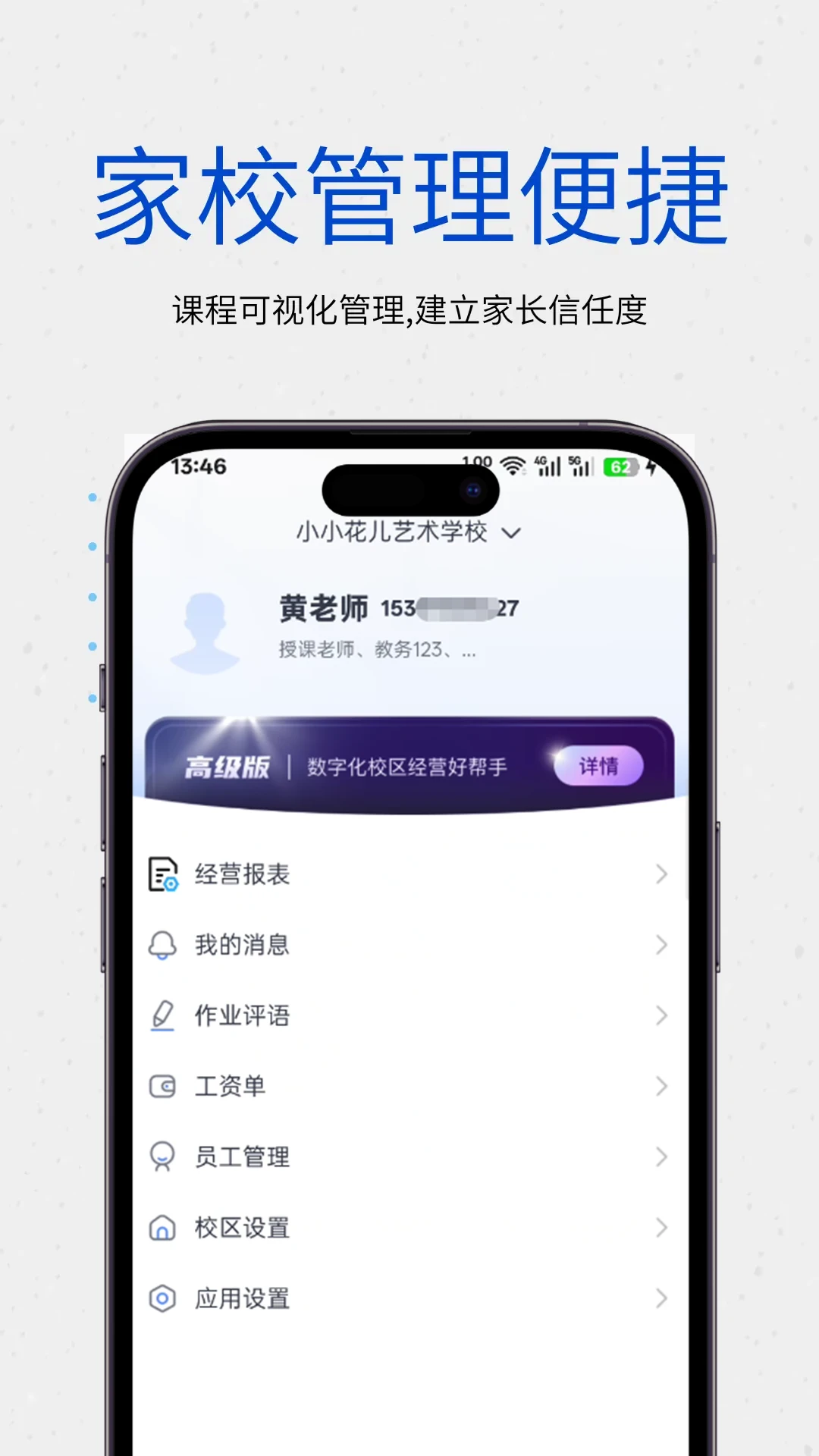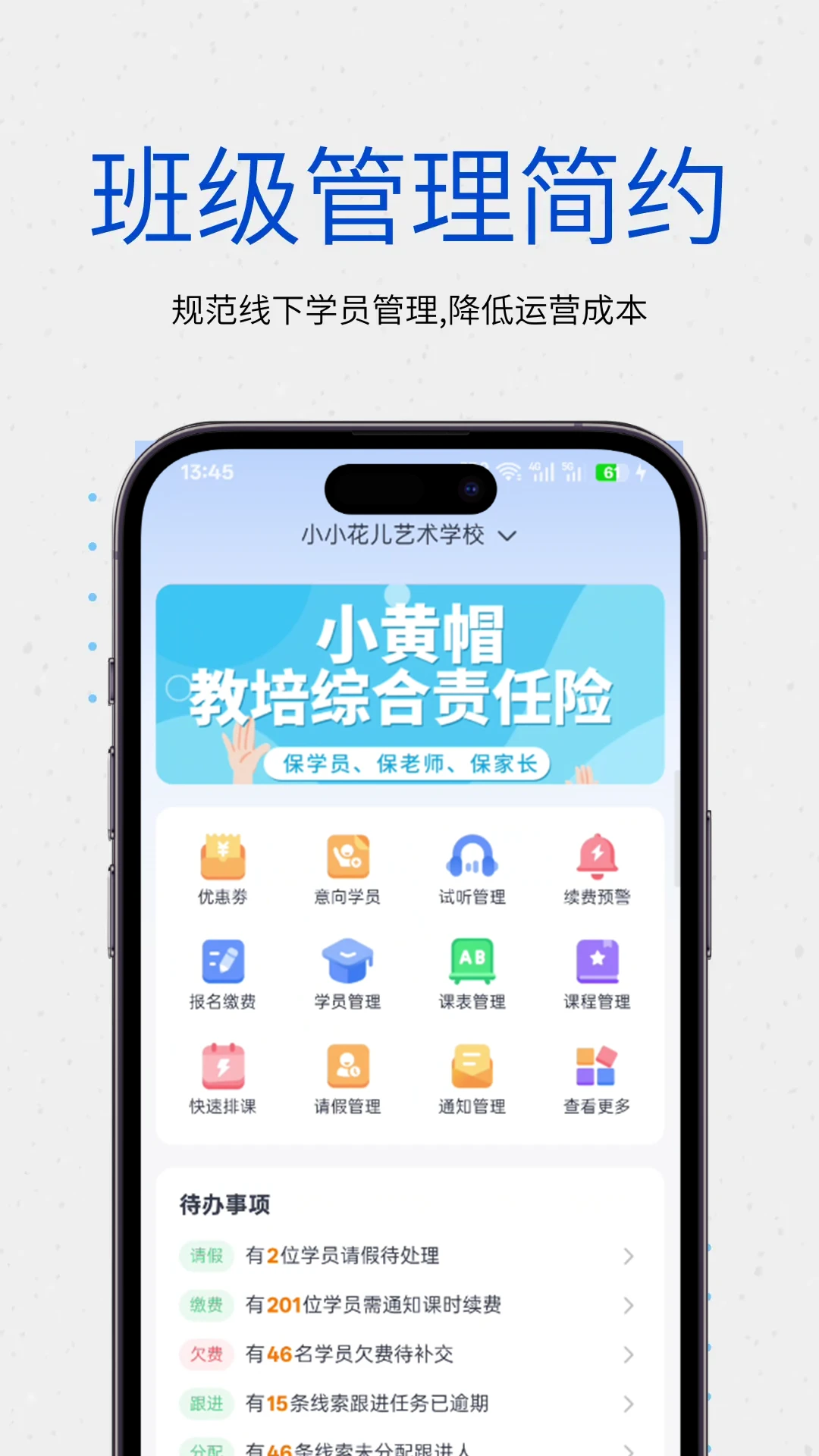 帮助机构教务管理、招生营销、财务管理、家校互动等核心场景,为校长降低教务管理成本,全方位拓展招生途径,为日常决策提供数据支持,让家校互动更加便捷。1、教务管理①智能排课:排班排课冲突可视,班级课表自动生成;②打卡考勤等多种途径,课时课消自动统计;③在线管理:学员/班级/课程管理有章可循。2、招生管理①移动招生工具:海量招生方案任校长挑选,满足多种招生场景;②在线转介绍:会员优惠促进老带新,获取精准学员线索;③CRM系统:实时跟踪意向学员,销售过程可视化,提升线索转化效率。3、财务管理:①收款码自动报名:学员扫码自助缴费,支持多种收款设备;②退转课自动核算:退课转课联动操作,收费差价流水清晰;③教师工资自动算:工资统计维度丰富,一键结算高效准确;④财务报表:财务报表,助于校区科学决策。4、家校互动①课后作业:在线布置作业,学员实时接收;②成长档案:记录学员成长进步,拉近家校距离;③掌握学习/教学动态;④打卡督学:培养学员学习习惯,课后服务更有保障。