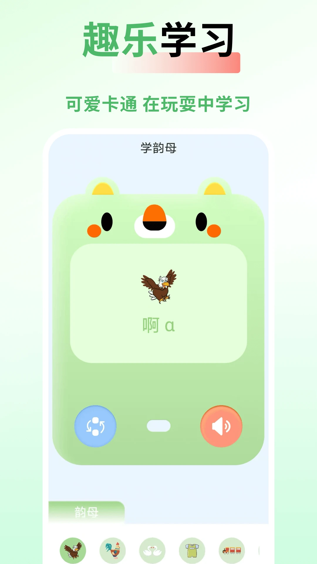 拼音学习系统:包含声母、韵母、字母、完整音节等模块,通过动画演示和互动练习帮助孩子掌握拼音基础