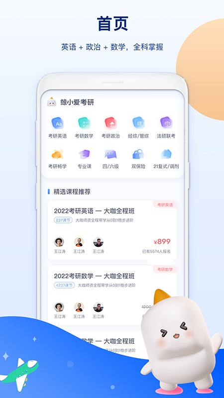 鲸小爱考研学习是一款专为考研学子量身定制的智能学习平台,由武汉鲸小爱教育科技有限公司倾力打造。该应用整合了考研全学科优质资源,包括政治、英语、数学等公共课以及各专业核心课程,所有内容均由资深教师团队精心研发。通过AI技术赋能,平台不仅能提供系统化知识讲解,还能根据用户学习数据智能推荐个性化复习方案。其特色在于将传统备考与智能科技完美结合,帮助考生突破学习瓶颈,实现高效提分。