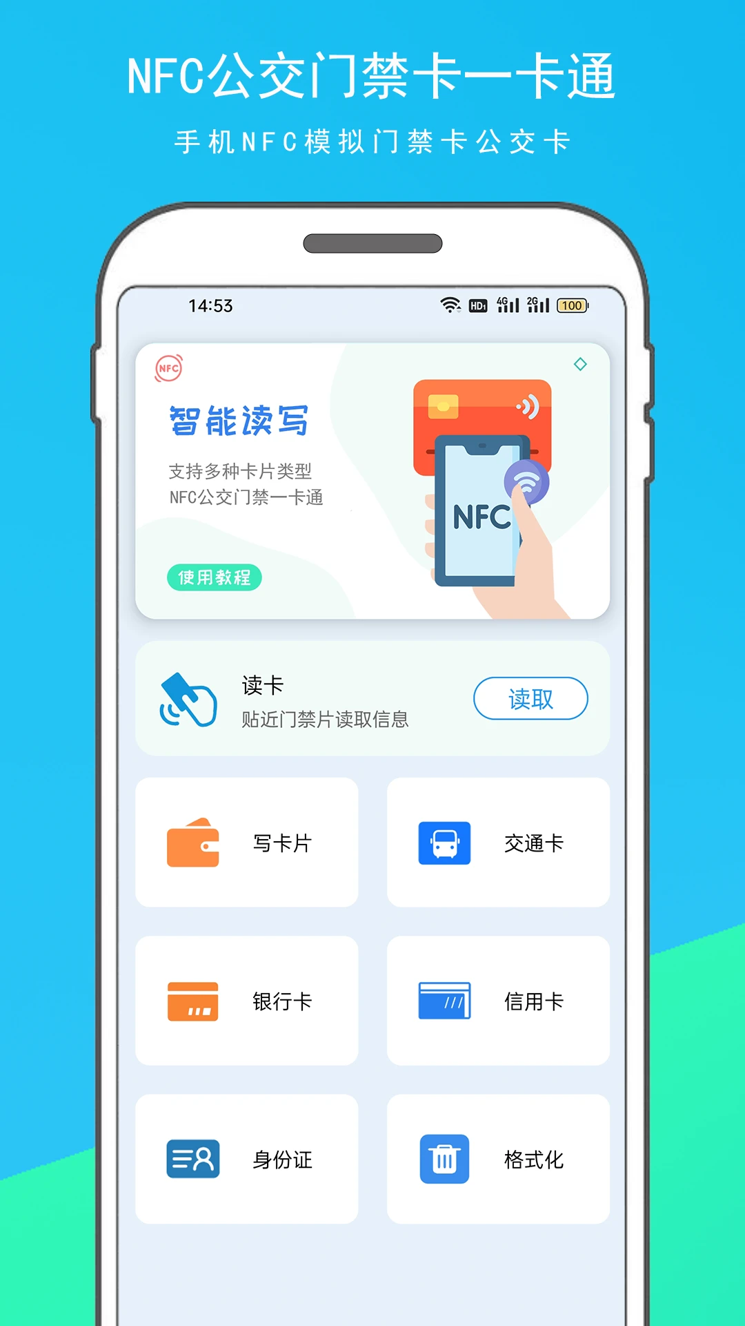 NFC读写器是一款NFC读、写卡工具。支持NFC的手机可以当成借记卡、公交卡、门禁卡、电梯卡、停车卡等IC卡使用。轻松把钥匙放进手机,解决你忘记带钥匙、带门卡的烦恼。卡包管理功能可以将各种卡片存入卡包,使用时随时复制信息,方便快捷。