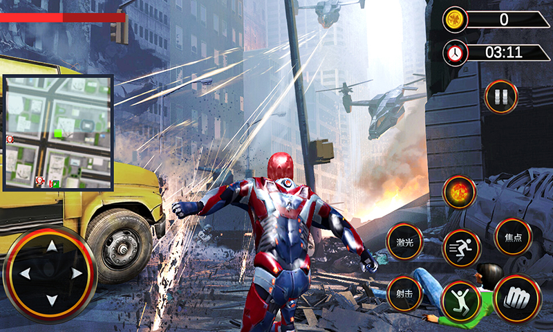 城市飞行英雄市视角和FPS模式下的城市破坏,您讲扮演一位城市英雄,在整个城市内打击犯罪,保护城市!游戏支持第一人称和第三人称视角自由切换,让玩家获得最佳游戏体验。