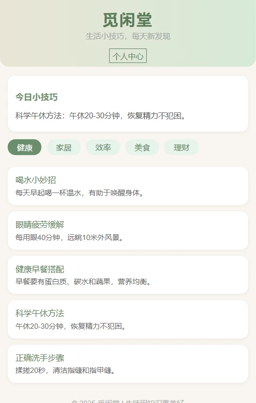 觅闲堂汇集实用生活妙招,涵盖健康、家居、效率、美食、等领域。从浴室防滑到科学午休,从早餐搭配到正确洗手,让平凡生活更轻松、更优质。
