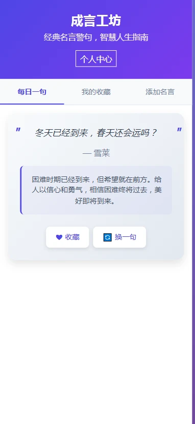 收藏与分享:支持用户收藏喜欢的名言,并一键分享至社交平台,传递智慧与正能量。
