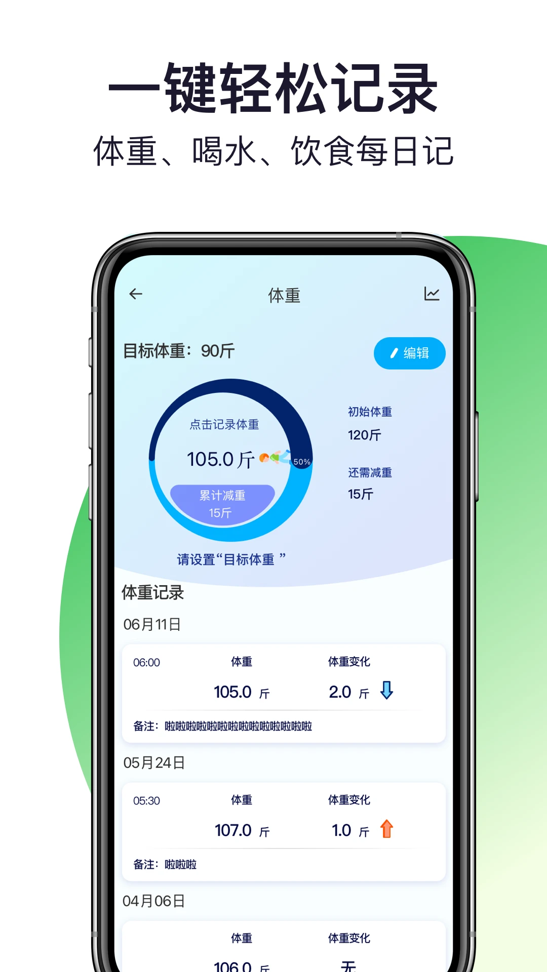 记录体重变化:每日一键输入体重数据,自动同步历史记录,形成完整曲线。