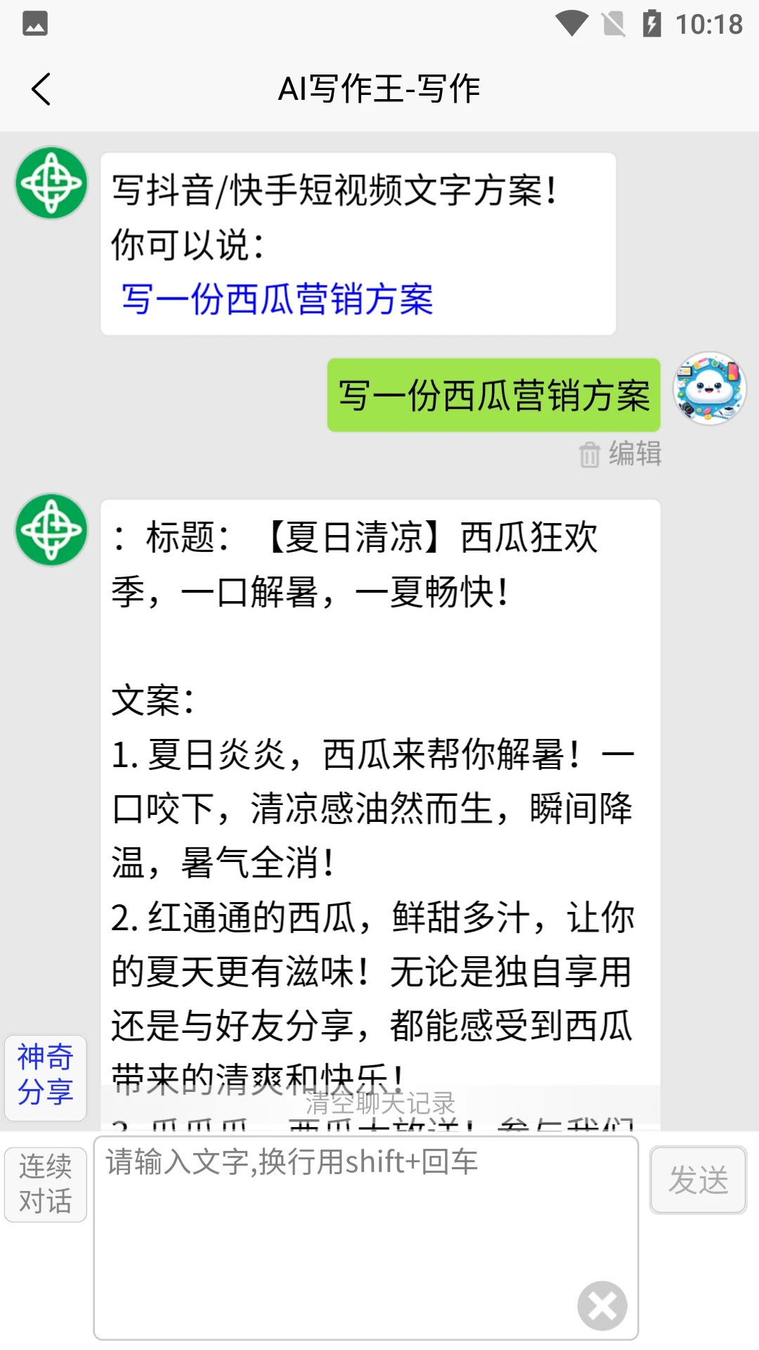 AI写作王是一款集成写作、绘图、聊天、问答和翻译功能于一体的AI智能应用。无论您是需要灵感激发还是语言翻译,AI写作王都能帮助您快速完成任务。通过智能问答功能,您可以随时向AI提出问题获取答案。同时,AI写作王还支持绘图功能,让您可以直观地表达自己的想法。无论是写作创作还是语言交流,AI写作王都是您身边的得力助手。