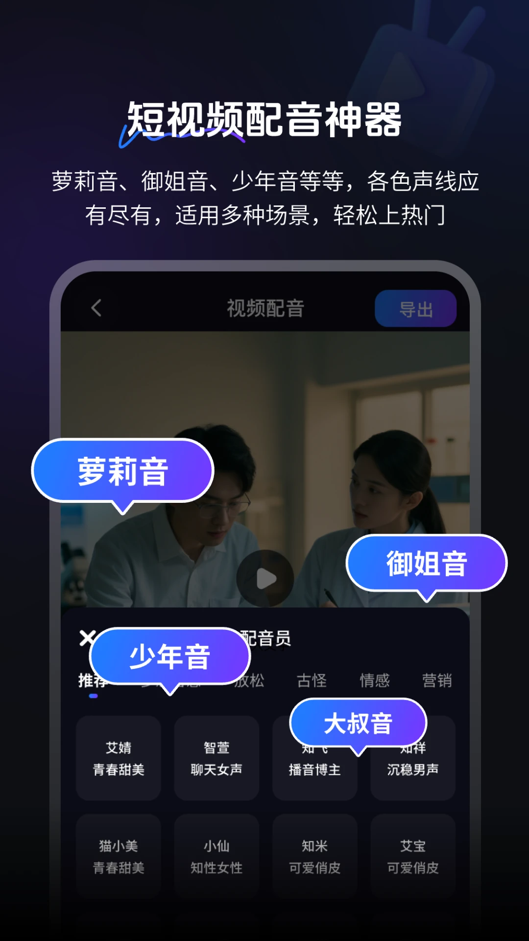 多角色配音功能,提供丰富声库选择,满足不同视频氛围需求。