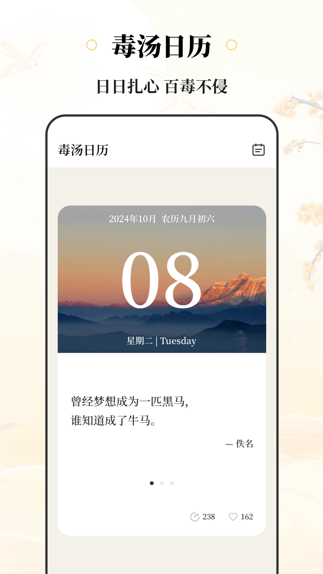 【情感共鸣】毒汤日历的每一句话都经过精心挑选,能够引发用户情感共鸣,缓解压力。