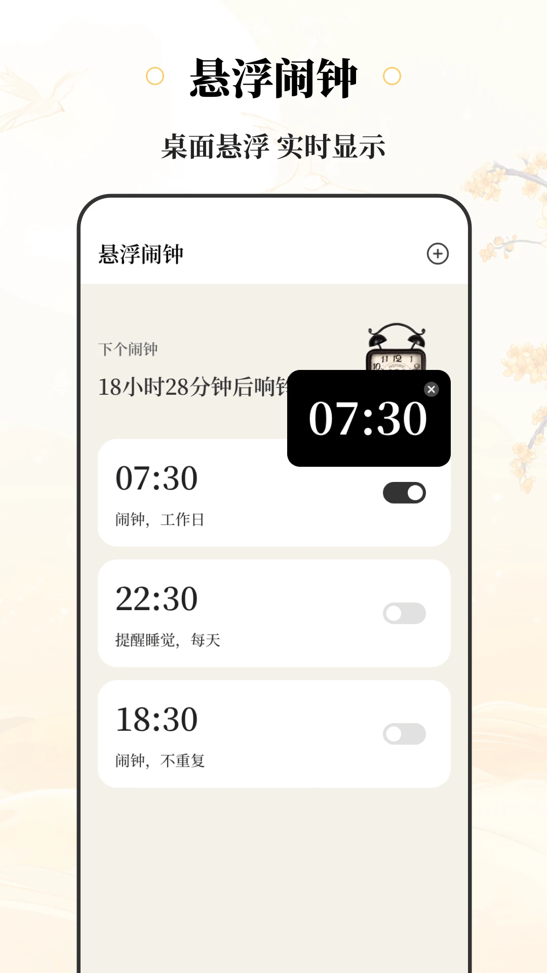 【悬浮闹钟】支持自定义提醒事项,悬浮窗设计不干扰其他应用,让时间管理更加高效便捷。