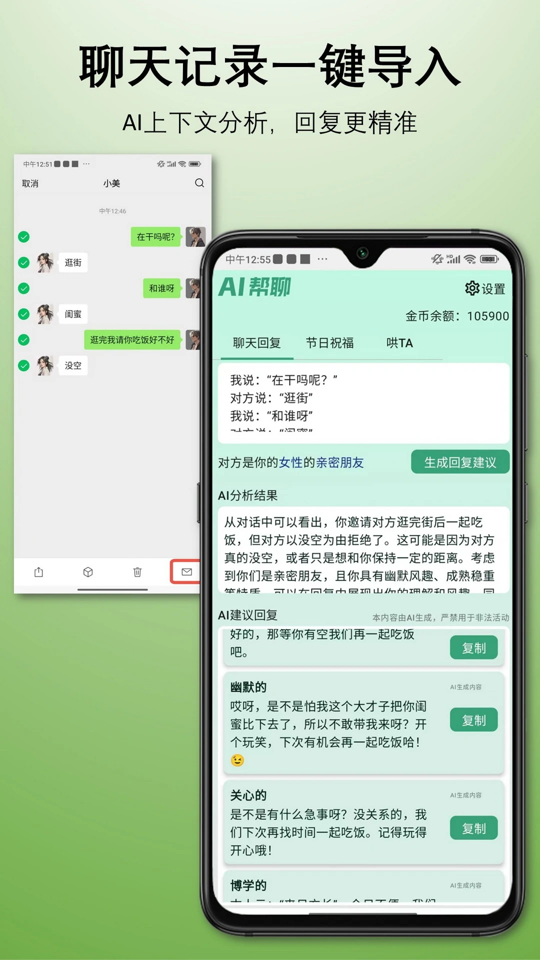 《AI帮聊》——拯救你的社交尴尬!不再为不会聊天发愁!还在为社交聊天绞尽脑汁?看到消息半天不知道怎么回?朋友生日、同事升职、兄弟结婚,不会说祝福话?对象生气了,发个"嗯"就完了?别怕,《AI帮聊》来了!这是一款专为"社交菜鸟"量身定制的AI聊天神器,让你分分钟变身聊天达人!1.不会聊天?AI教你妙语连珠!输入或粘贴对方的聊天内容,AI秒变你的社交军师,生成幽默、稳重、撩人、正式等不同风格的回复,让聊天不再尴尬!2.祝福语不尴尬,让你的祝福温暖人心!3.哄TA开心,让感情升温!AI帮聊帮你分析对方的情绪,告诉你TA为什么不开心,并生成最合适的安慰和哄人回复,让感情更进一步!4.微信聊天记录导入,AI更懂你!不用每次手动输入,直接导入微信聊天记录,AI帮你精准分析聊天上下文,生成最贴合的回复!再也不用担心AI"答非所问",让你的每条回复都恰到好处!5.设定你的个性标签,定制专属聊天风格!你可以设定自己的性格标签(幽默风趣、理性成熟、直率耿直、深情暖男……),AI就会根据你的风格生成个性化的回复,让聊天更有你的专属味道!