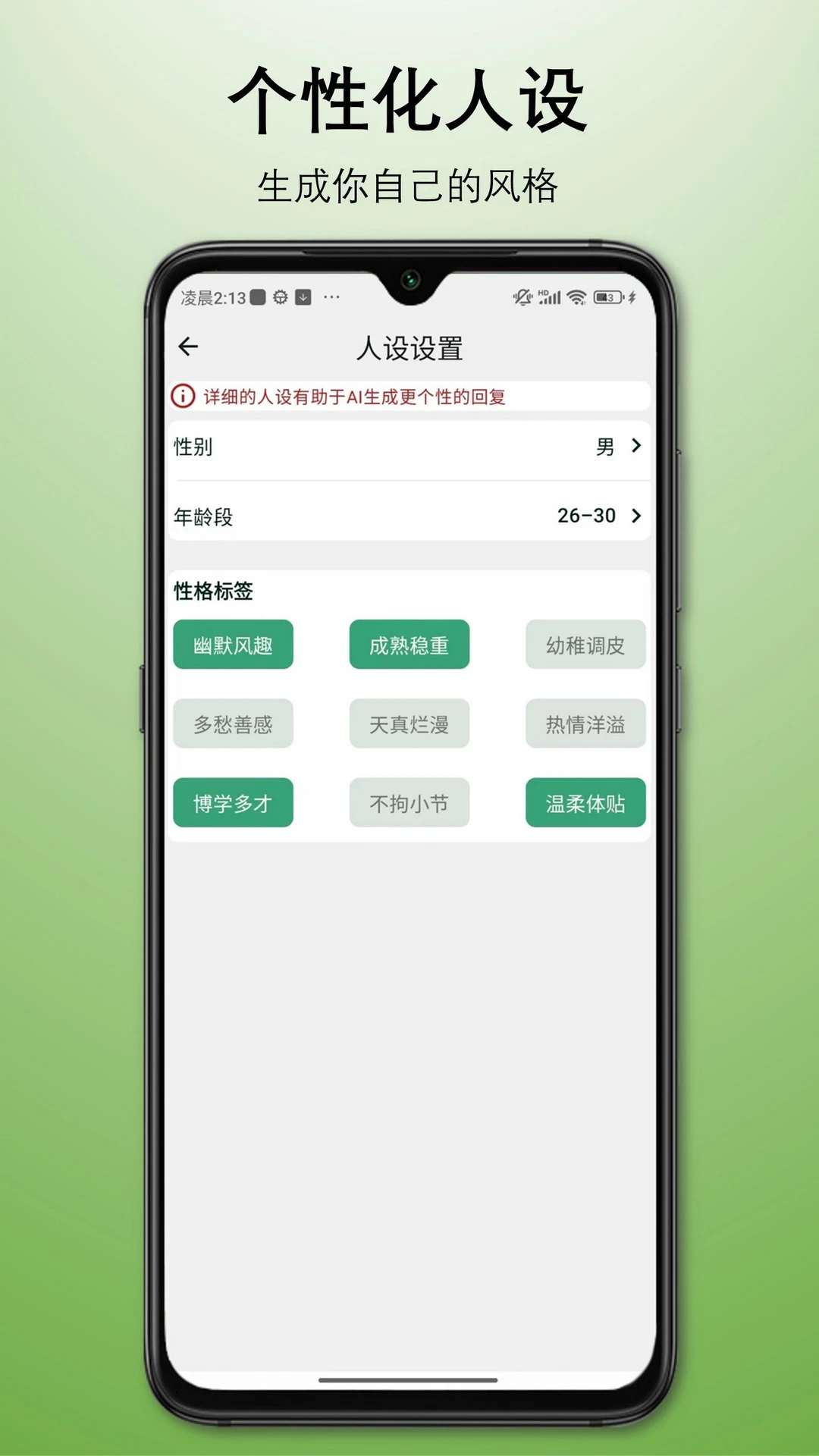 个性化标签系统:内置20+性格特征选项,用户可自由组合创建专属聊天人格,确保回复内容与本人说话风格高度一致。