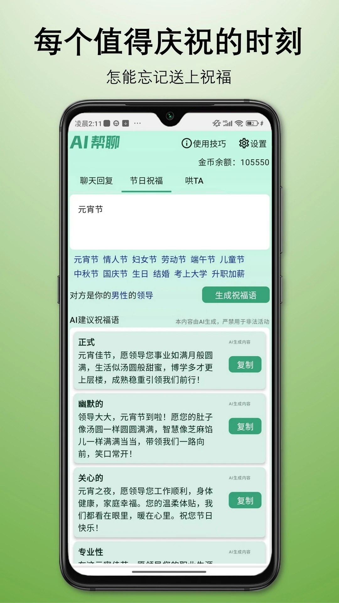 多场景适配:覆盖日常社交、职场沟通、情感交流、节日祝福等12大类社交场景,每种场景提供3-5种不同风格的应答模板。