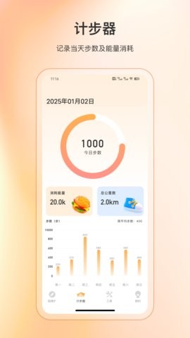 每日步数统计,计算热量消耗,显示行走的公里数和时间,日报表和月度报表详细记录;
