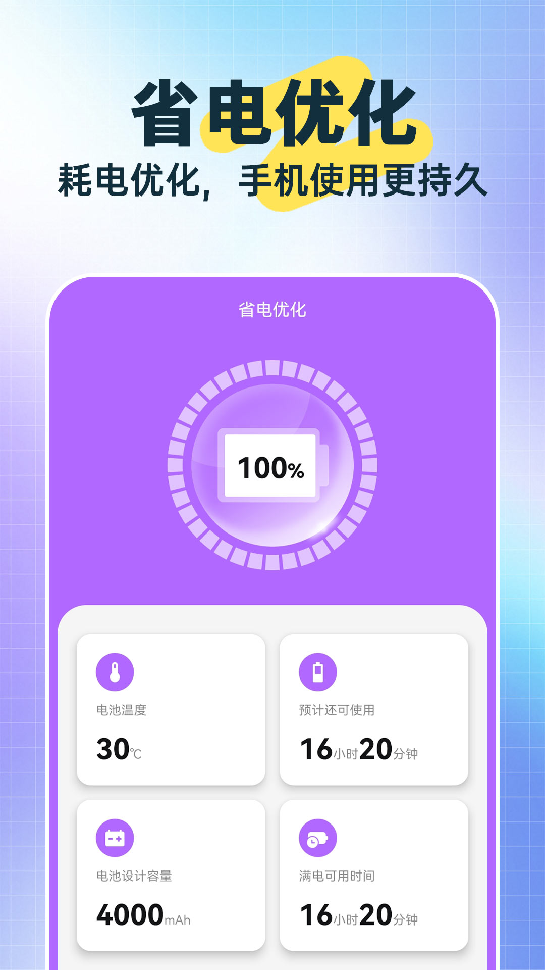 电池省电充电是一款专为智能手机用户设计的电池优化与充电管理应用。它通过智能算法分析电池使用情况,提供个性化的省电方案,帮助用户延长电池续航时间。同时,该应用还具备快速充电功能,能够优化充电过程,减少充电时间,保护电池健康。