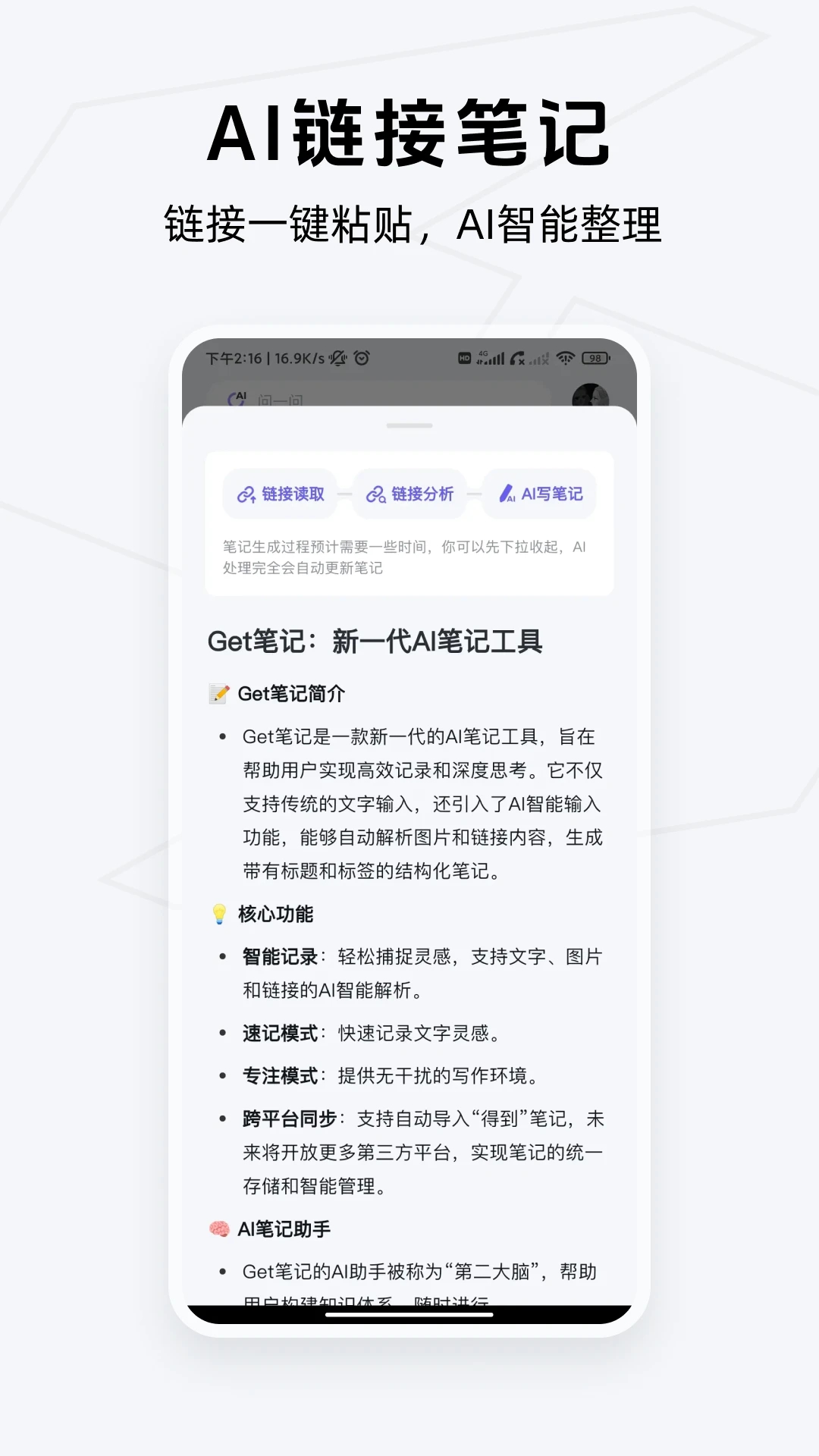 - AI链接记录:添加一条链接,AI自动读取网页内容,生成简洁明了的笔记,方便你日后查阅。