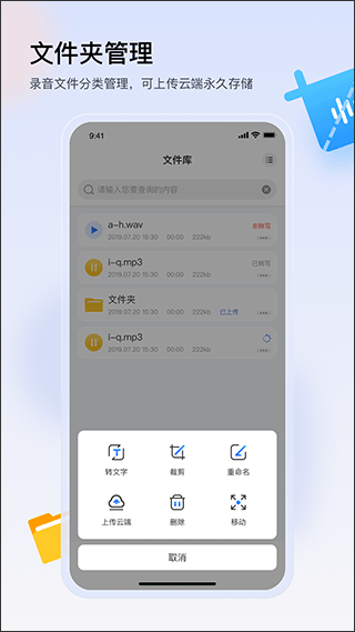 【文件夹管理】录音文件可按项目、日期等分类管理,支持上传至云端永久存储,方便随时调取。