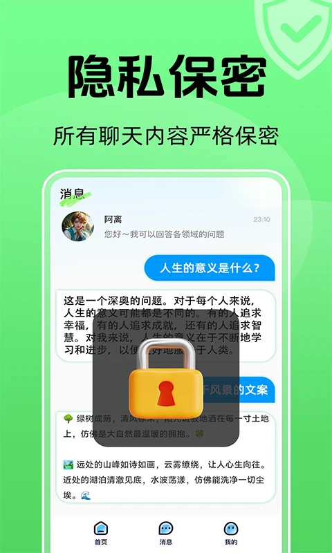 加密聊天室是一款专为注重隐私与安全的用户设计的加密聊天应用,结合了先进的加密技术与智能机器人对话功能,为用户提供安全、便捷且智能的沟通体验。无论是日常聊天、信息查询还是学习辅导,这款应用都能满足用户的需求。其简洁高效的用户界面设计让操作更加直观,帮助用户快速上手,专注于与AI助手的互动。加密聊天室致力于打造一个安全、智能且高效的沟通环境,是隐私保护与智能交互的完美结合。