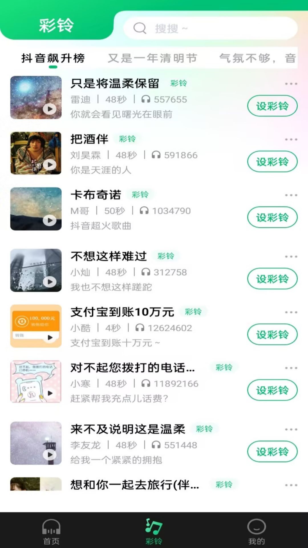酷音铃声汇集了当下最热门的歌曲,包括《小城夏天》、《三拜红尘凉》、《故事还长》、《我曾遇到一束光》等,每一首都经过精心挑选,确保音质清晰、旋律动人。无论是流行、摇滚还是民谣,你都能在这里找到适合自己的铃声。此外,我们还定期更新热门榜单,让你紧跟潮流,不再错过任何一首好歌。