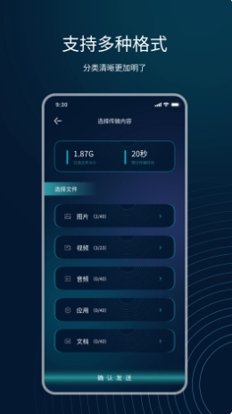 选择好自己想要传输的文件就可以了,在传输时两部手机都需要安装软件,这样才能顺利传输。软件体积小巧,安装快速,兼容市面上绝大多数安卓和iOS设备,确保良好的互通性。