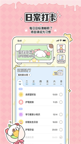专属的打卡计划,让你每周设定目标并按时完成,培养高效的时间管理,久而久之,自律就会变成一种习惯,生活慢慢会走向正轨。打卡成功后还会有小奖励动画,激励你继续坚持。
