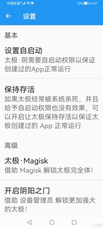 需要注意的是,如果用户需要使用Magisk模式,手机需要解锁Bootloader并获取Root权限。具体操作方法是先刷入太极阳Magisk模块包(magisk-taichi-v7.x),然后配合太极APP使用。这种模式适合高级用户,可以获得更全面的系统控制权限。