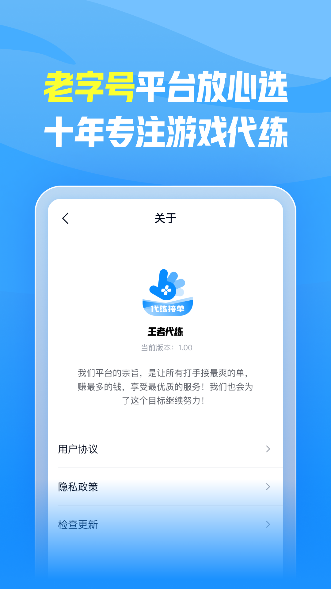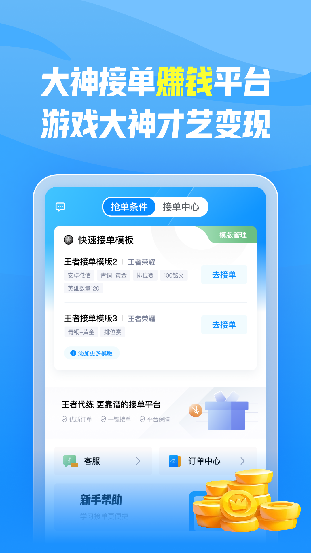 王者代练APP是一款专为游戏高手打造的接单赚钱平台,为热爱游戏的玩家提供了展现实力与变现的绝佳机会。在这里,技术精湛的玩家可以通过代练服务将自己的游戏技能转化为实际收益。平台汇聚了海量热门游戏订单,从《王者荣耀》到《原神》,覆盖多款主流游戏,满足不同玩家的接单需求。无论是想赚取零花钱还是全职代练,都能在这里找到适合自己的订单。我们致力于打造安全、高效、公平的代练环境,让每位玩家都能轻松接单,快乐赚钱。