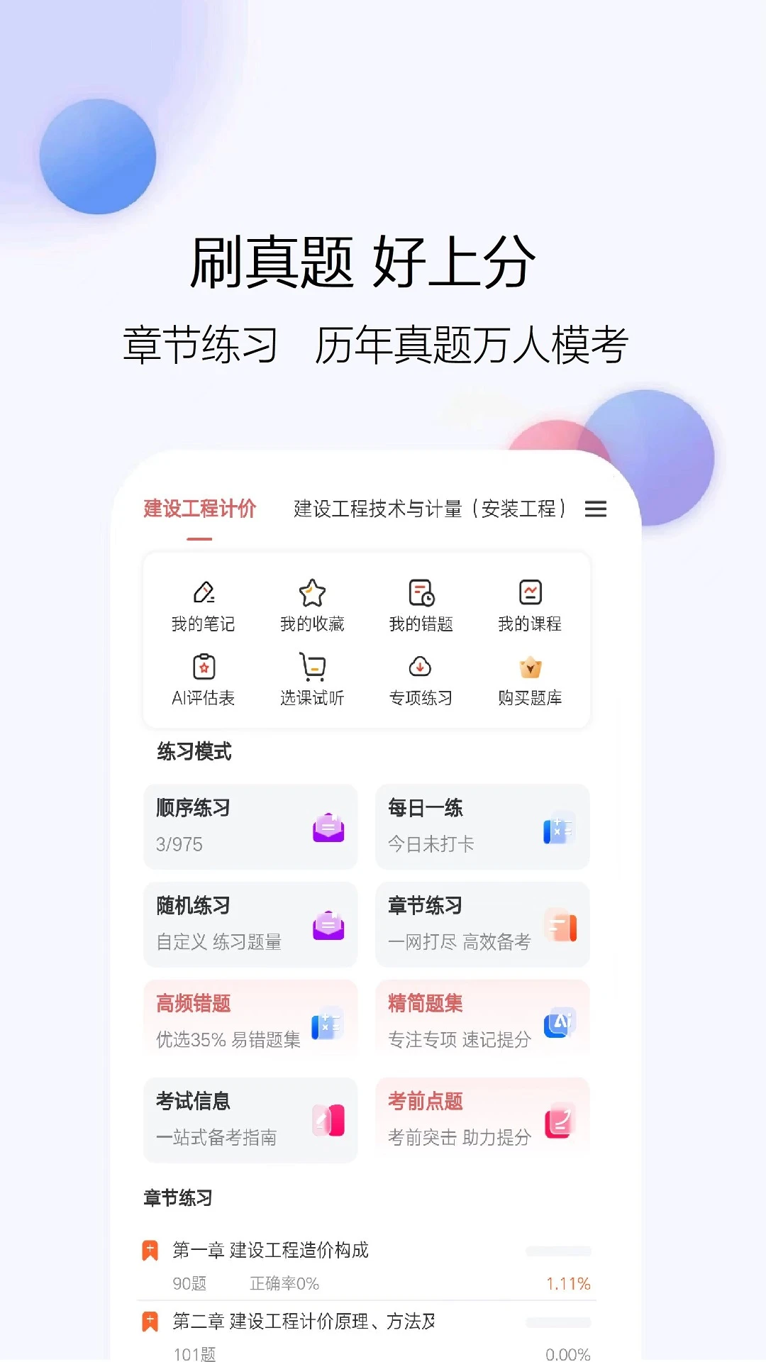 一级造价师APP,马上下载去体验!专为考试学员精心准备的考试配套题库,内容涵盖:精选题库、强师讲解、章节精讲、高频考点、高频易错、历年真题、冲刺密卷等多个模块,随时随地学习、省时省力备考。