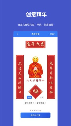 工具宝特别推出了为兔年春节打造的专属春联祝福功能,让用户能够轻松制作节日祝福内容。用户可以根据个人喜好定制独特的春联祝福图,打造专属的节日问候。应用内还提供了多种精美的贺卡背景和精选祝福语文案,让您能快速创建个性化的图片贺卡,为亲朋好友送上温馨的节日祝福,传递真挚情感。