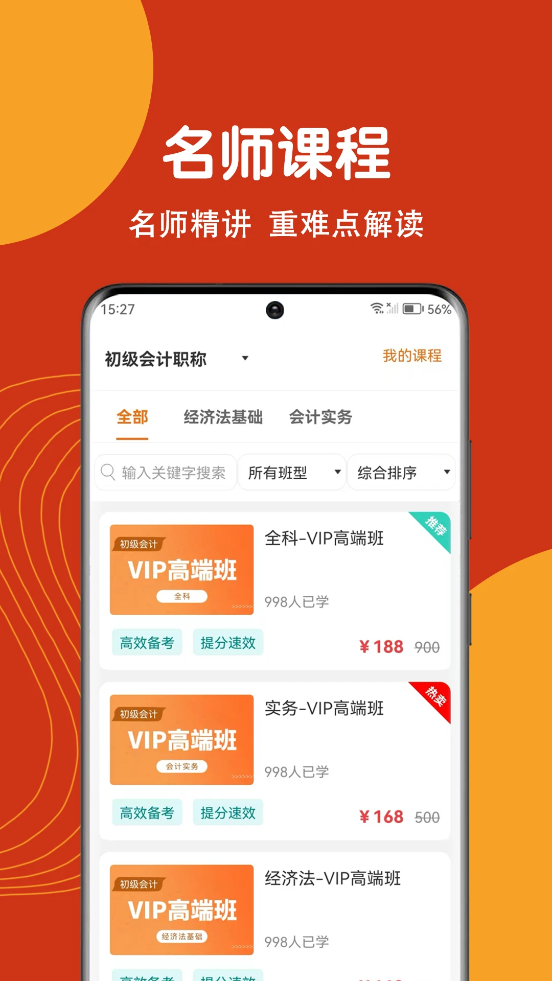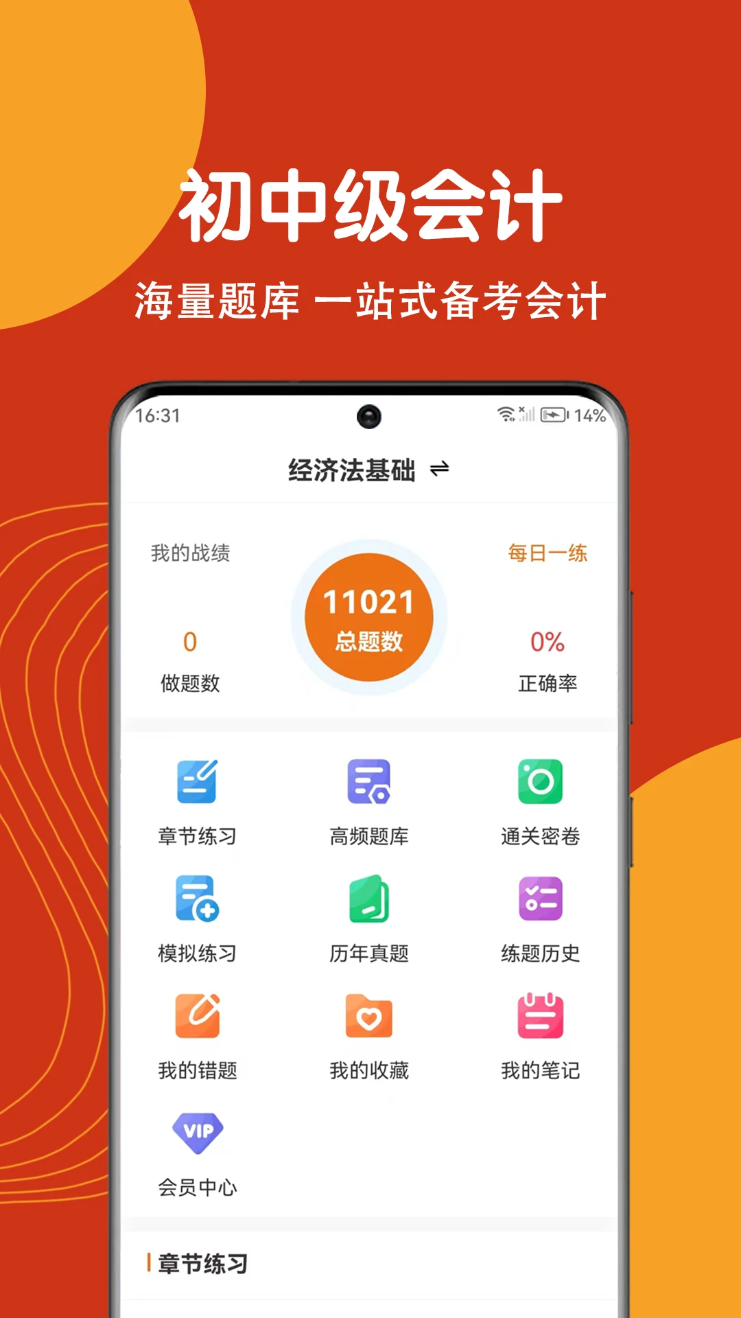 精选题库模块:覆盖初级和中级会计考试所有科目,按章节分类,支持按知识点筛选题目。