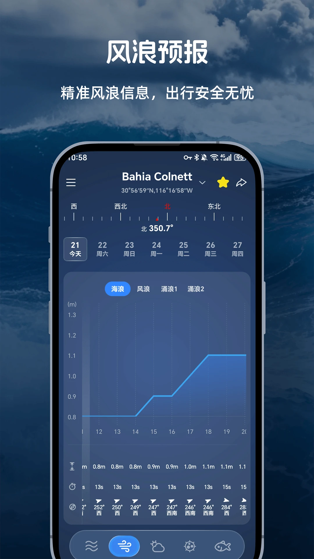 多维度天气整合:同步显示风速、浪高、降水概率等关键气象指标